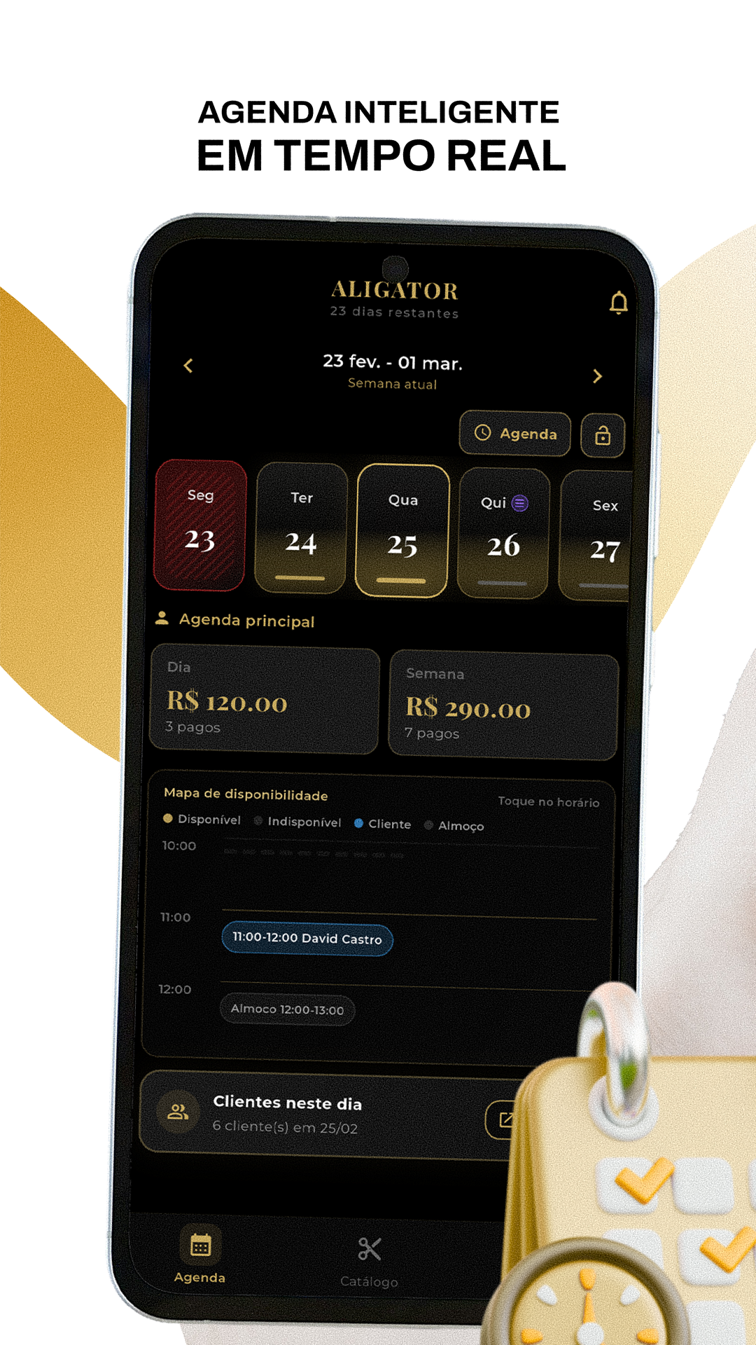 Visualizacao clara da semana, disponibilidade do profissional e leitura imediata do que esta pago, ocupado ou livre.